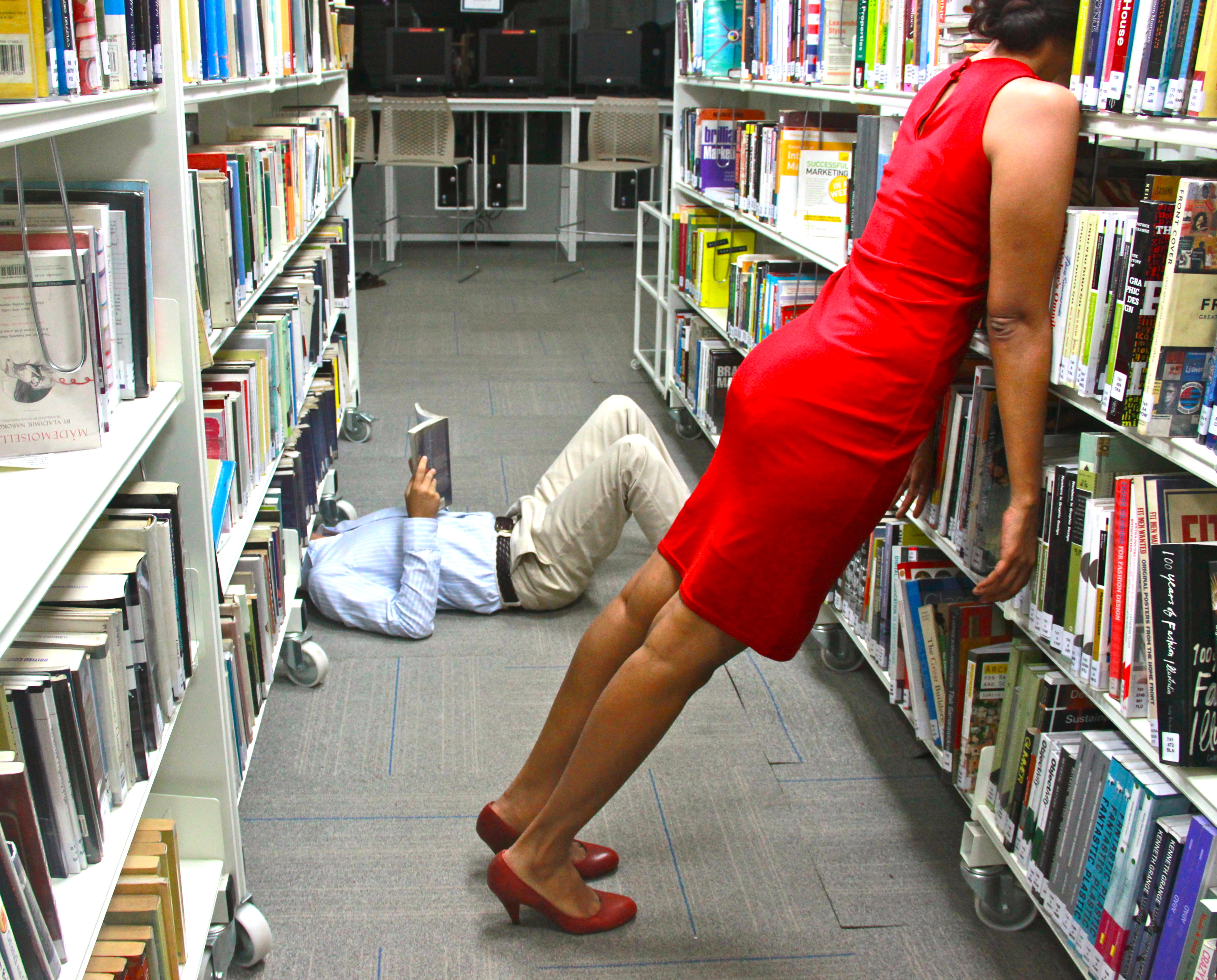 All the lights are on – illuminating the rows of bookshelves and the listening corner, a nook for the children’s section and another devoted to magazines, all monitored by the librarians’ counter. When the actors move, their bodies are segmented by shelves, my view of them framed by, obscured and revealed by the spines of books. With a few steps they move from an adult world into one designated suitable for children; from the space dedicated to a reader already immersed in a language to the seat of a learner struggling to master it. It’s all these sharp juxtapositions that make this a very nice library, but an even more interesting performance space.