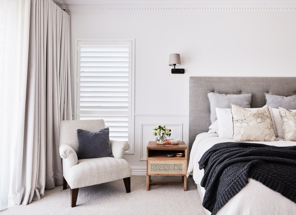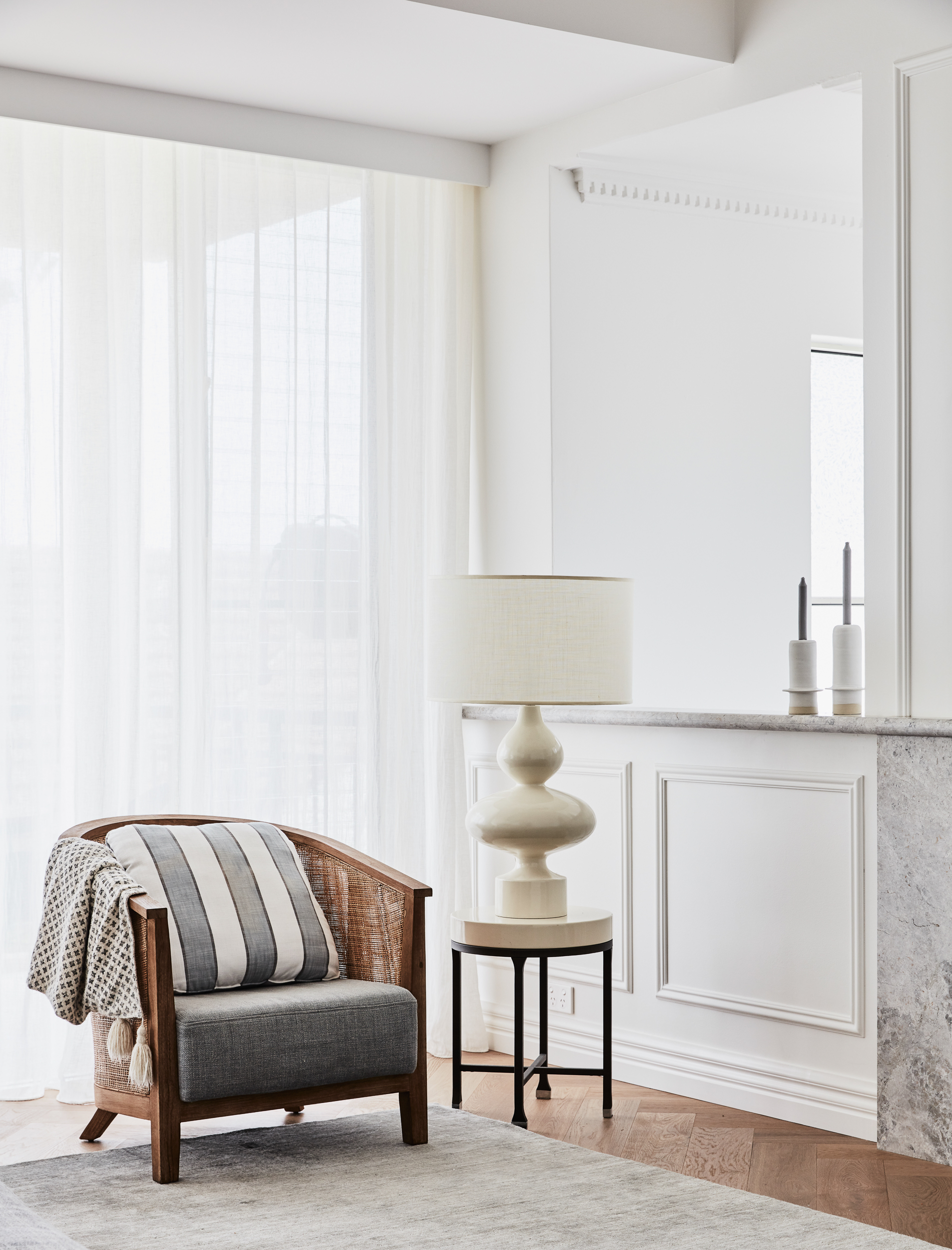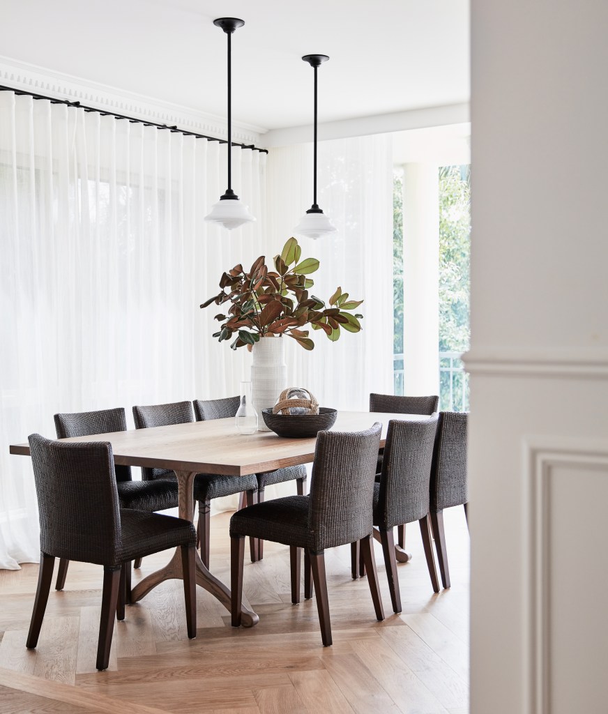 The blue waters of the bay are visible not only from the main living and dining areas but the master bedroom as well. EB Interiors wanted to reflect the serenity of the home’s coastal outlook in the style, selecting practical and durable materials that would last the test of time and opting for simple but quality finishes and furnishings. These include a bespoke dining table made with American oak finished in a raw matte and a Kashi art silk rug in duck egg by Boyd Blue. A gentle glow emanates from an Openwork light from Laura Kincade which is flush mounted and circled by hand rubbed antique brass. The fireplace and porch are framed by grey limestone.