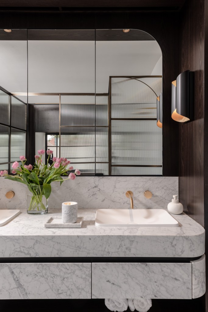Harris had long been in love with how the entire building was graced with stone columns, windowsills and internal archways that curved and arched as if made of some altogether more fluid material. Isabelle Harris Design wanted to extend those yielding lines to the interiors she was creating, incorporating them into the marble benchtop, vanities and joinery. By deliberately softening any sharp edges, she allows the house to gently envelope its inhabitants. There are no shortcuts here – the craftsmanship is as demanding as it looks: seamless, distinctive and an indisputable demonstration of mastery.